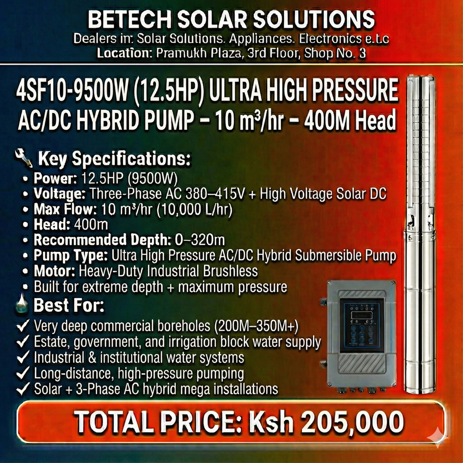 With a lift capacity of up to 400 meters, it is ideal for commercial boreholes ranging from 200m to 350m+, large estates, industrial users, irrigation blocks, institutions, and government water schemes.