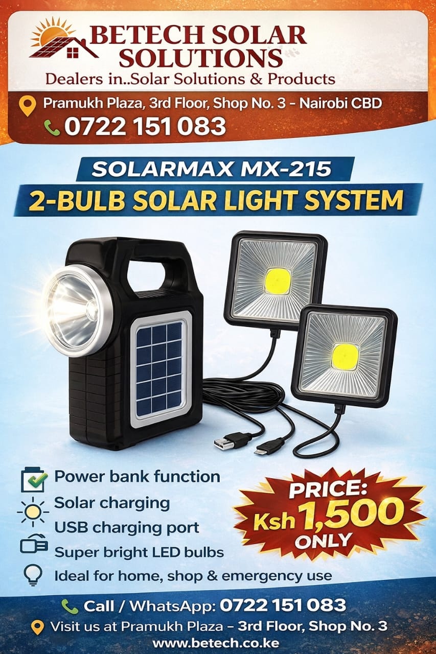 he SOLARMAX MX-215 2-Bulb Solar Light System is a compact and reliable solar lighting solution designed for everyday home and emergency use. It is ideal for small households, shops, students, and areas without reliable electricity.
