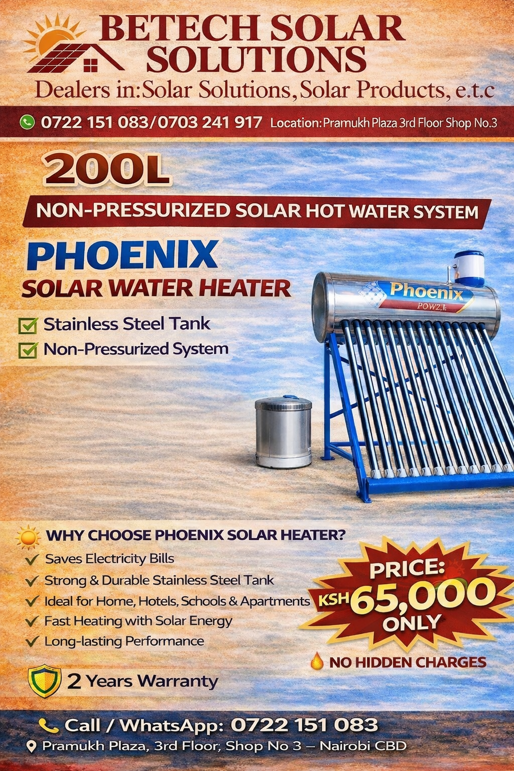 With a 200-litre capacity, it is ideal for homes, apartments, schools, and small hotels. The non-pressurized design makes it simple to install, easy to maintain, and highly durable for long-term use. Built to withstand Kenyan weather conditions, this system ensures dependable performance all year round.